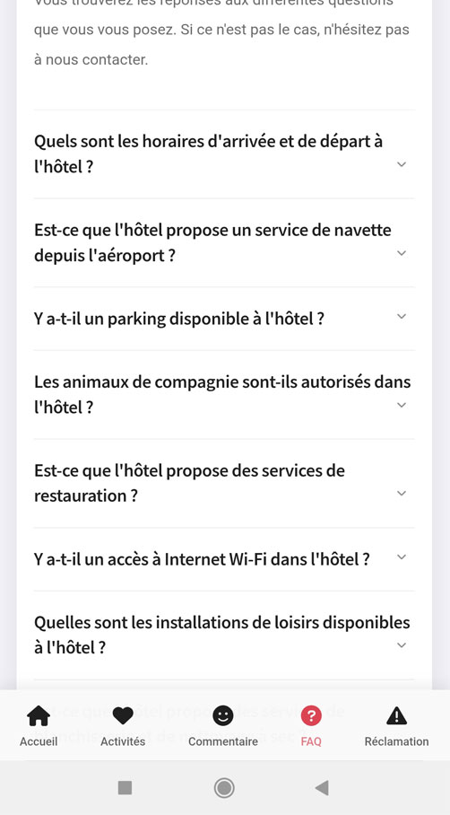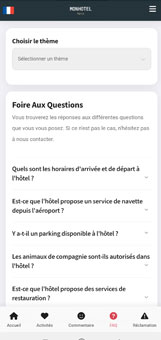 Grâce à la FAQ intégrée dans notre Guest App, vos clients trouvent instantanément les réponses à leurs questions : horaires du petit-déjeuner, services disponibles, règles de l’hôtel, accès Wi-Fi… Plus besoin d’appeler la réception, tout est accessible en un clic pour un séjour fluide et sans stress !