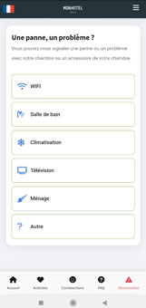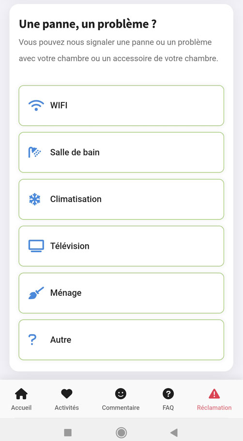 Avec notre Guest App, vos clients peuvent signaler instantanément un problème dans leur chambre (ampoule défectueuse, chauffage, ménage…) en quelques clics. La réception est immédiatement avertie et peut intervenir rapidement, garantissant un service réactif et une expérience client optimale.